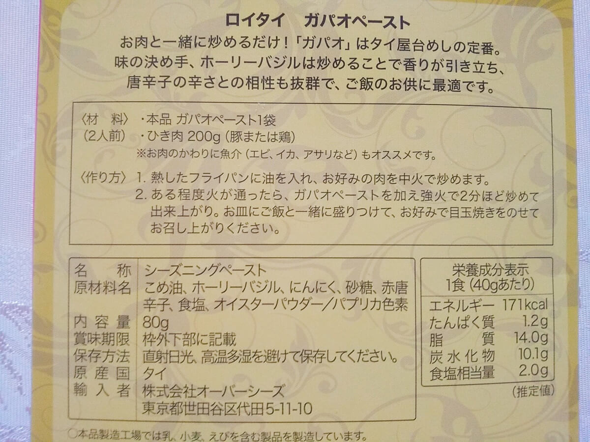「ガパオ」はホーリーバジルで炒めた挽き肉などをご飯に添えた、庶民的なタイ料理です。 ホーリーバジルは日本では入手しにくいためスイートバジルで代用されがちですが、ロイタイのガパオペーストはさすがタイ産。本場の味が出せるホーリーバジルが使用されています。