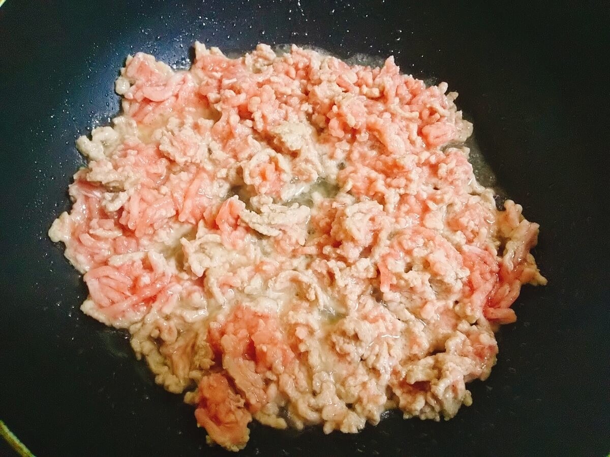①フライパンに油を入れ、ひき肉を中火で炒めます