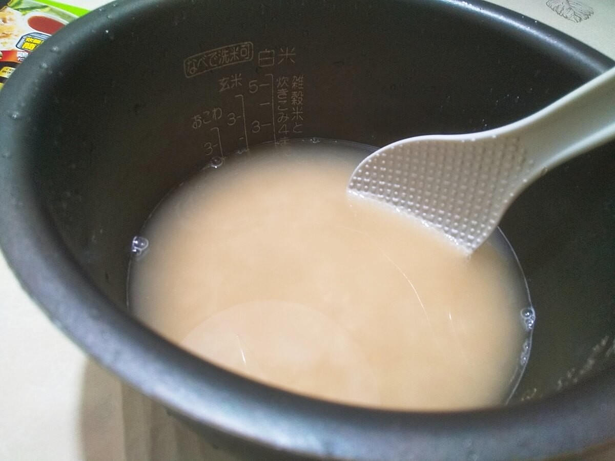 ①炊飯器にといだお米と炊き込みスープを入れ、お水を2合の目盛りまで注いでかきまぜます