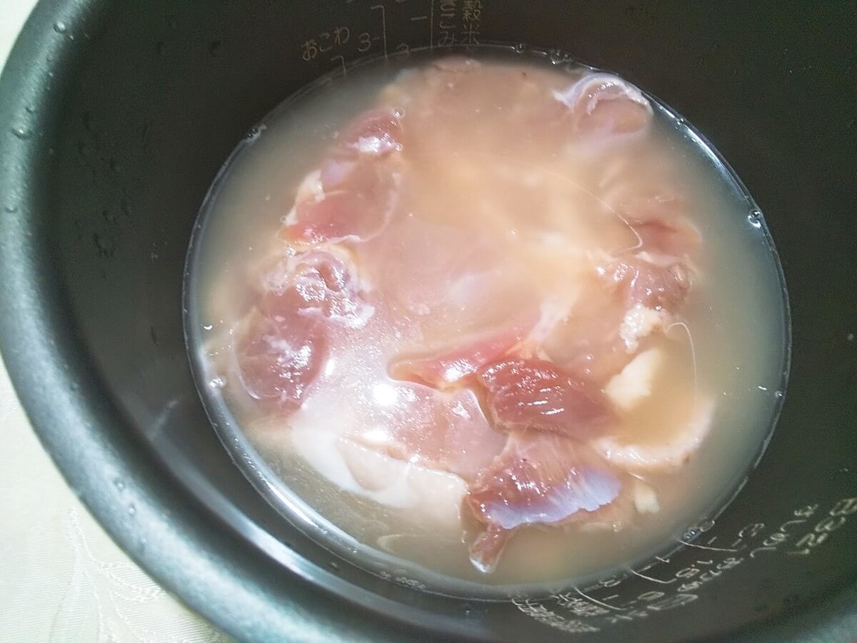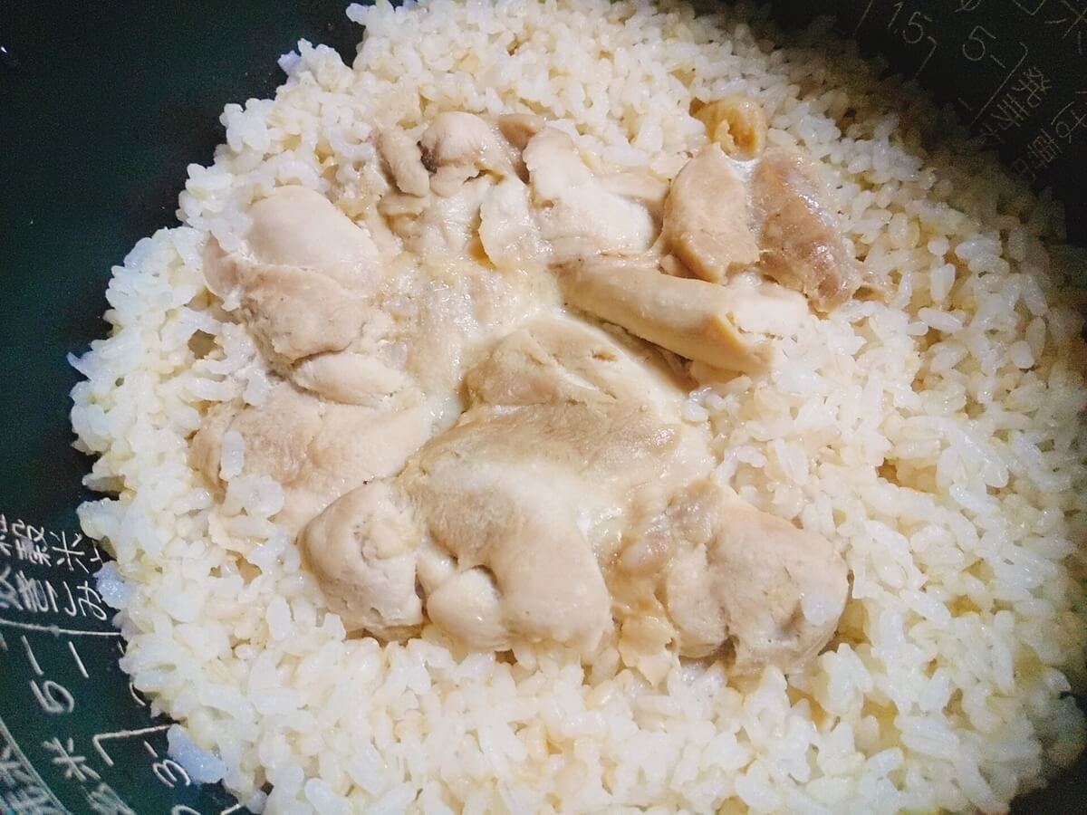 ②鶏もも肉は切らずにそのままのせ、炊飯スタート