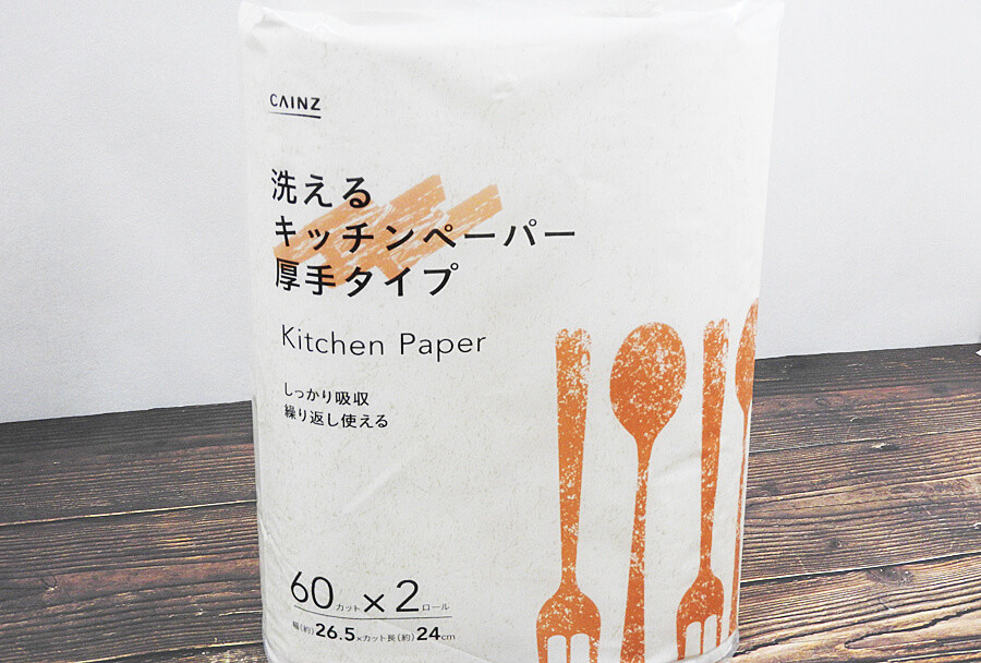 まずは、カインズ「洗えるキッチンペーパー厚手タイプ」60枚×2ロール・598円(税込)を紹介。ただのキッチンペーパーと思いきや、水で洗って3回ほど繰り返し使えてとっても便利。