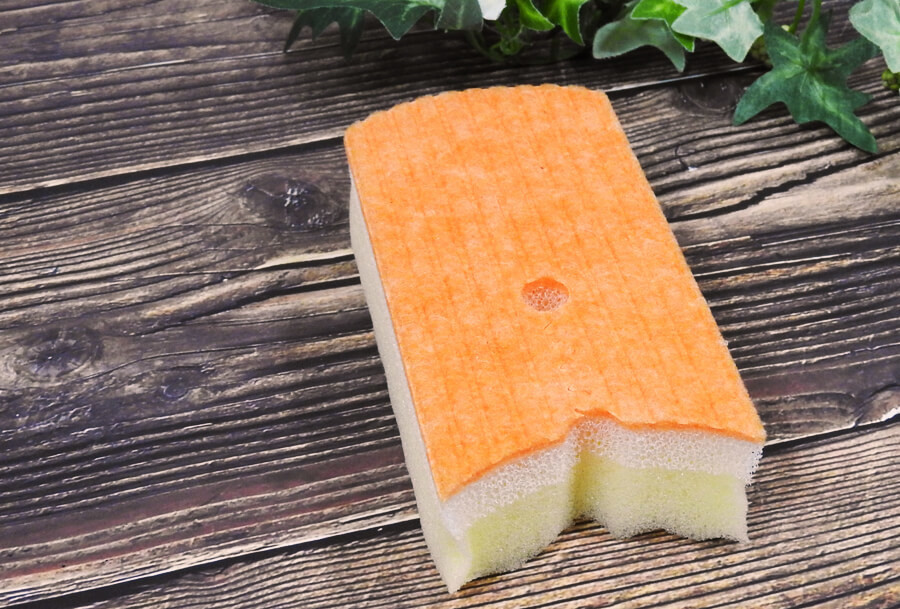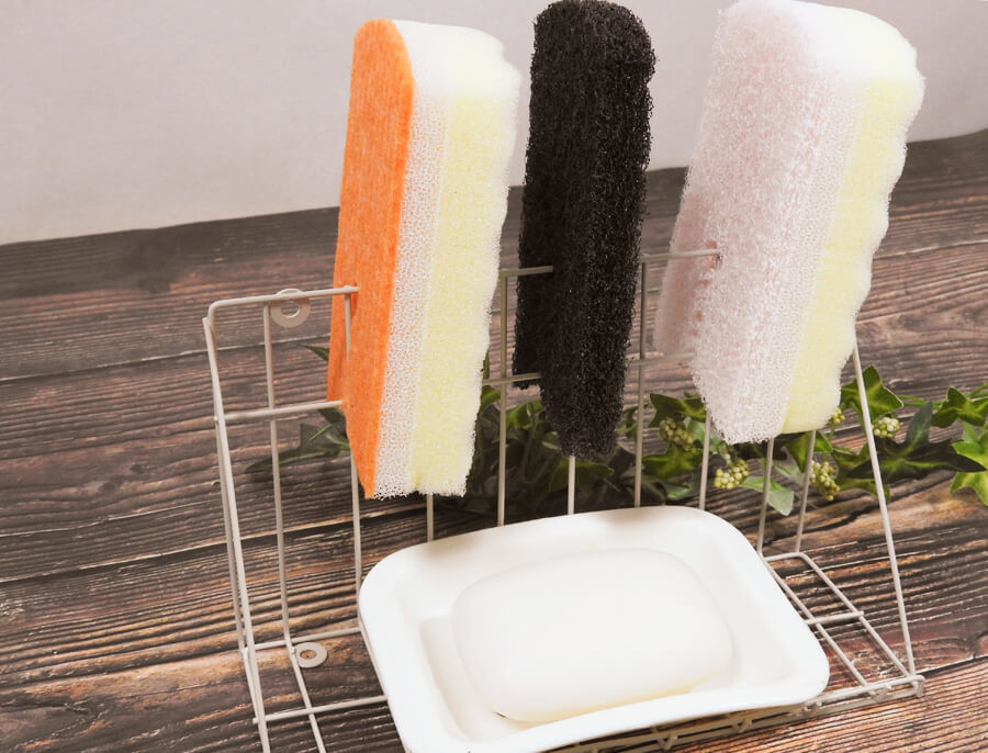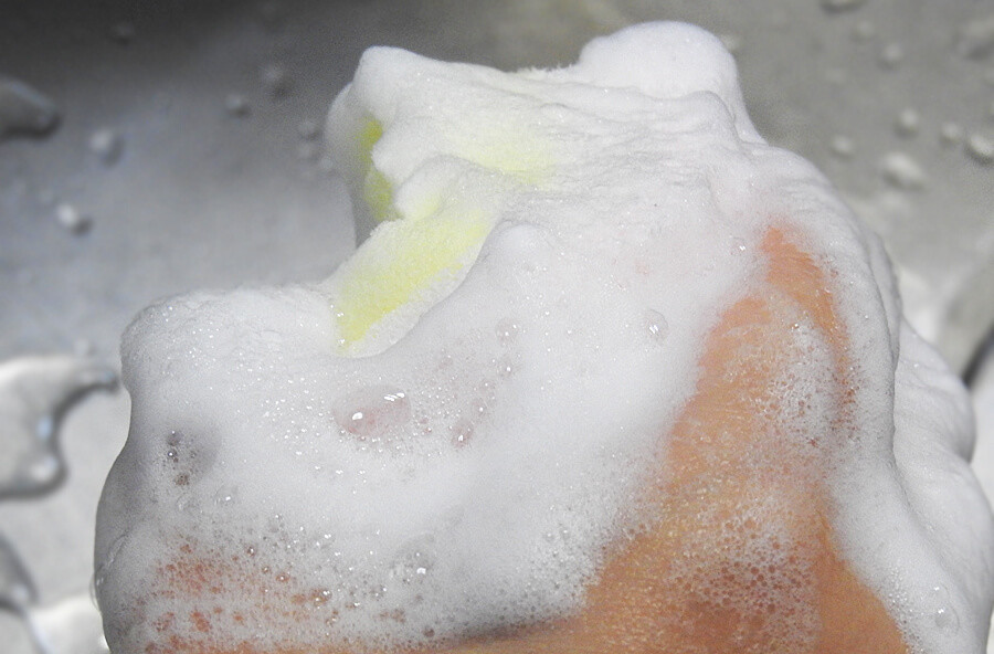適度に柔らかいため、洗剤を付けるとよくなじみます。スポンジをぎゅっとにぎると、きめ細やかな泡が立ちますよ。