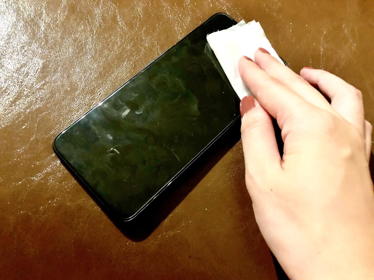 まずは先ほどのスマホ。クリーナーで1度拭きすると…。