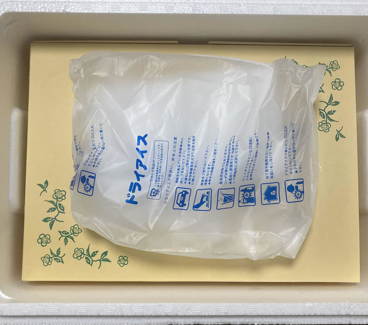 届いたアイス。ドライアイスは直接手で触ると危険なので袋に入っており、配慮されています。
