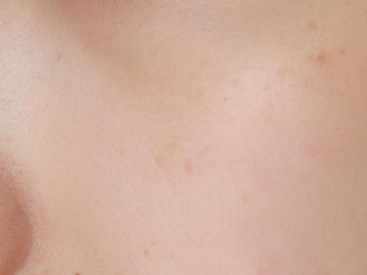 まずこちらはなにもしていないスッピンの肌です。シミが多々あり小鼻や頬にも赤みがあります。