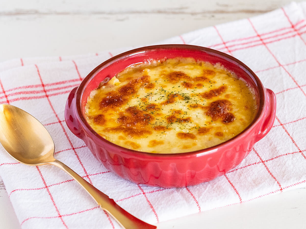 グラタン皿にごはんを入れたら「卵黄のコク深い味わい カルボナーラ」をごはんにかけ、その上からとろけるチーズをたっぷりと乗せます。