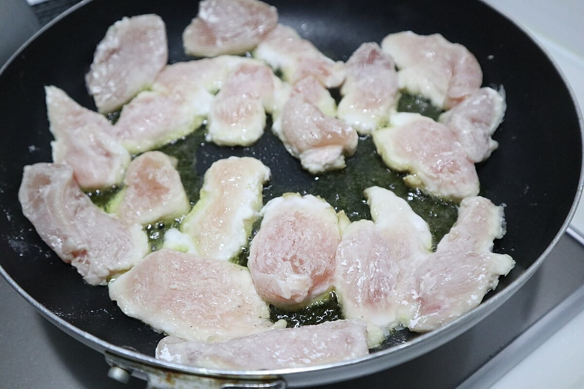 2、フライパンにオリーブ油を中火で熱し、鶏胸肉を焼く。