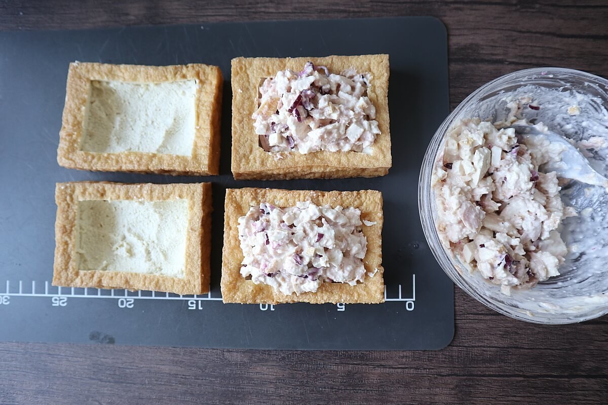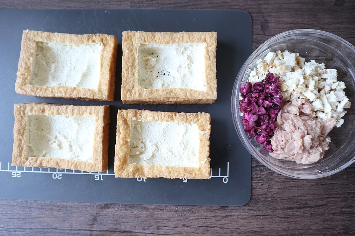 厚揚げは、側面と底を1cmほど残してくり抜きます。