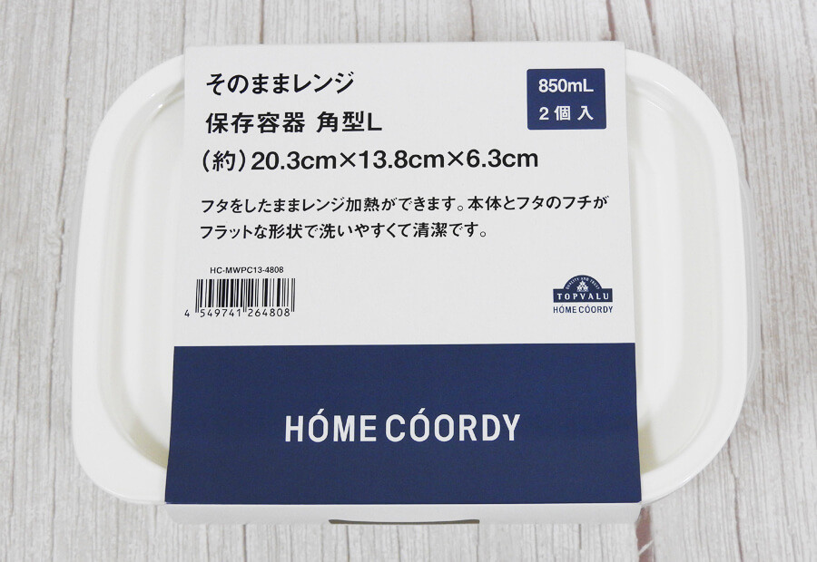 数あるホームコーディの保存容器の中でもお手頃価格なのが「そのままレンジ保存容器」。今回紹介する「そのままレンジ保存容器 角型L」850mlは2個入りで198円(税抜)です。1個あたり100円切ってますので、比較的お安いのはないでしょうか。