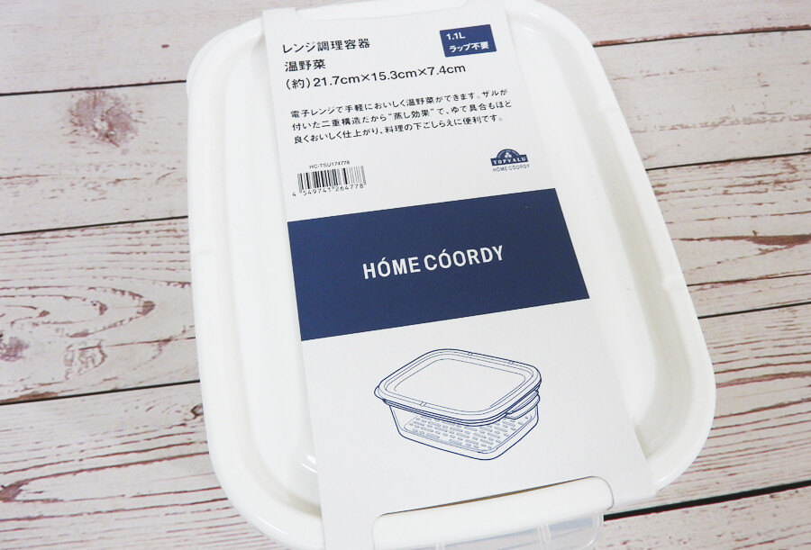 ホームコーディは保存容器だけではなく、レンジ料理容器も。うまく活用すれば、調理時間の短縮にもつながります。ホームコーディ「レンジ料理容器 温野菜」1.1L・198円(税抜)は、電子レンジで野菜の下ごしらえや温野菜を作る時に◎