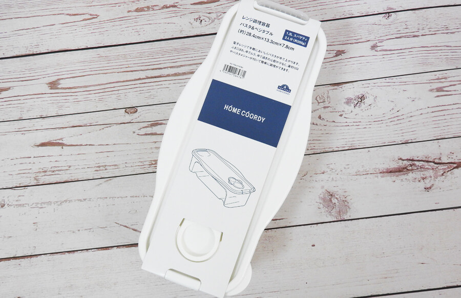 もう1つレンジ料理容器がありましたので、購入してみました。ホームコーディ「レンジ料理容器 パスタ&ベジタブル」1.3L・198円(税抜)です。100均でも同じような商品がありますが、ホームコーディはシンプルな色合いでおしゃれ。