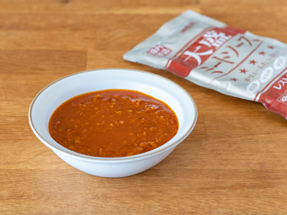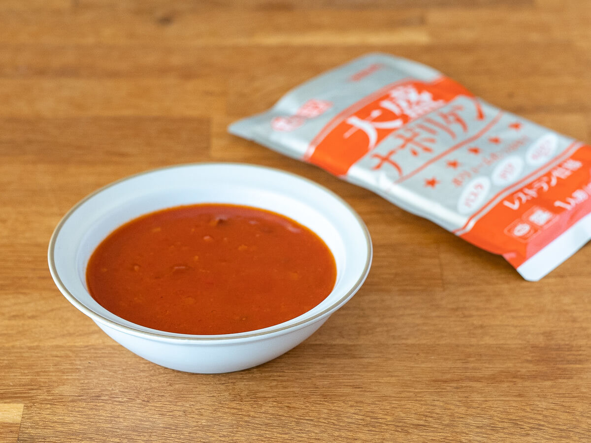 業務スーパーの「大盛ナポリタン」を湯煎で温め、中身のソースをうつわに出してみました。