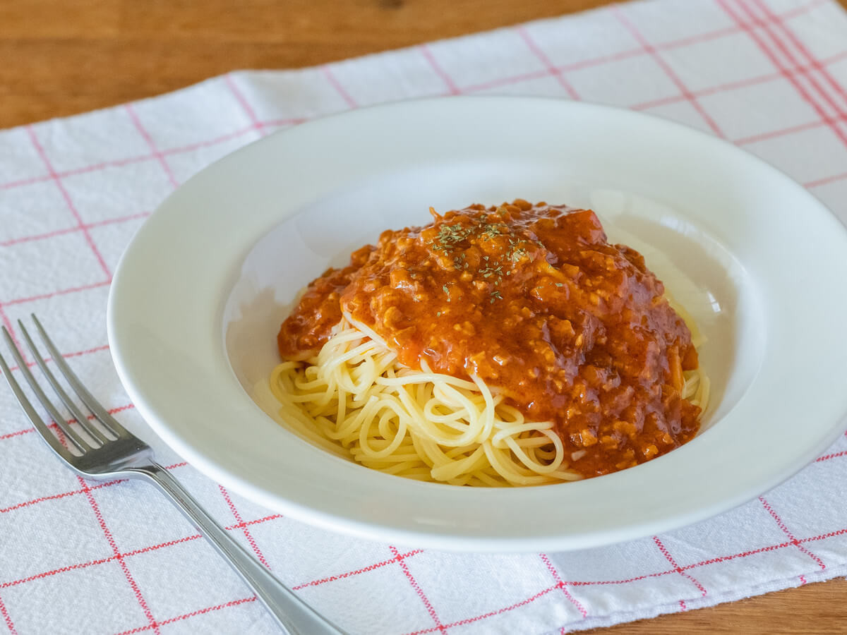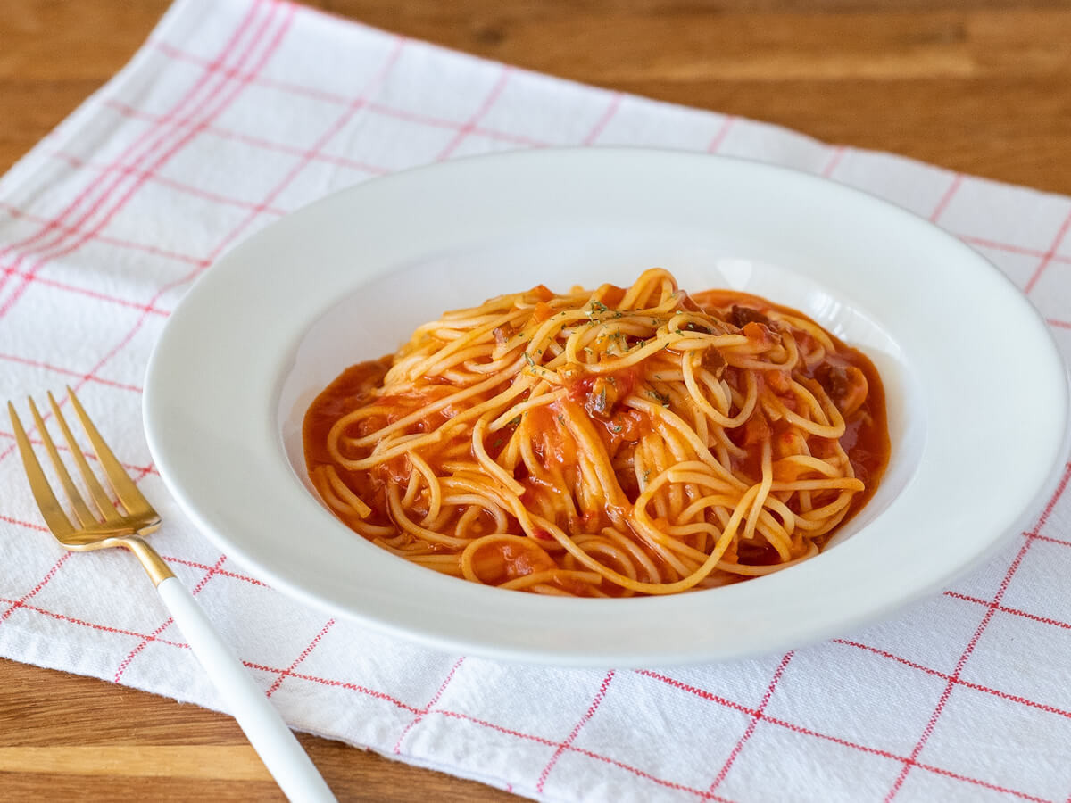 茹でたパスタに「大盛ミートソース」かけるだけで、手軽にミートソースパスタが完成!