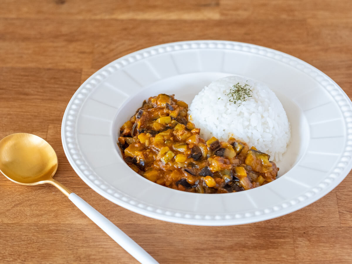 細かく切ったナスやコーンをオリーブオイルで軽く炒め、業務スーパーの「大盛ミートソース」とカレールウを加えてドライカレーを作ってみました。