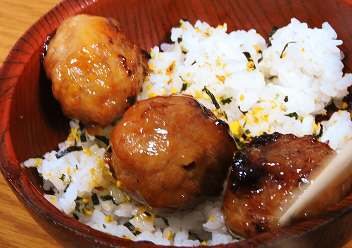 4歳の息子にはつくねを小皿に取り分けていましたが、いつの間にかつくねをごはんの上にトッピング。つくね丼みたいにして食べていました。途中「大きくて食べにくい」と言ってきたので、幼児にはやはり大きすぎるみたいですね。結局半分に切って食べさせました。