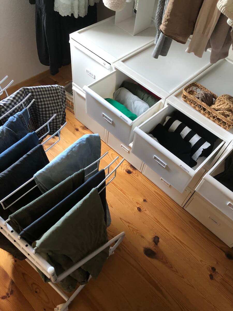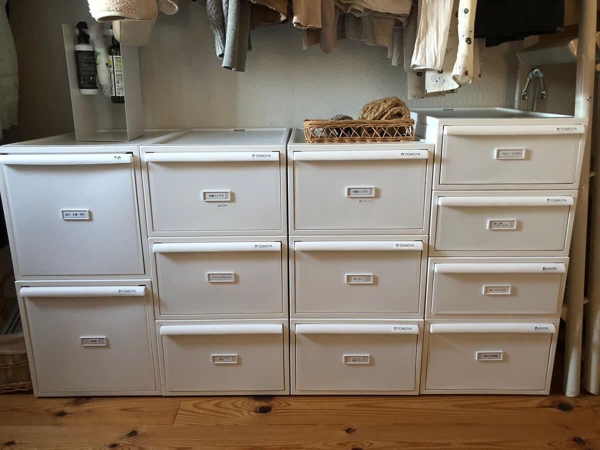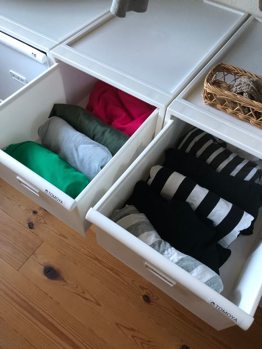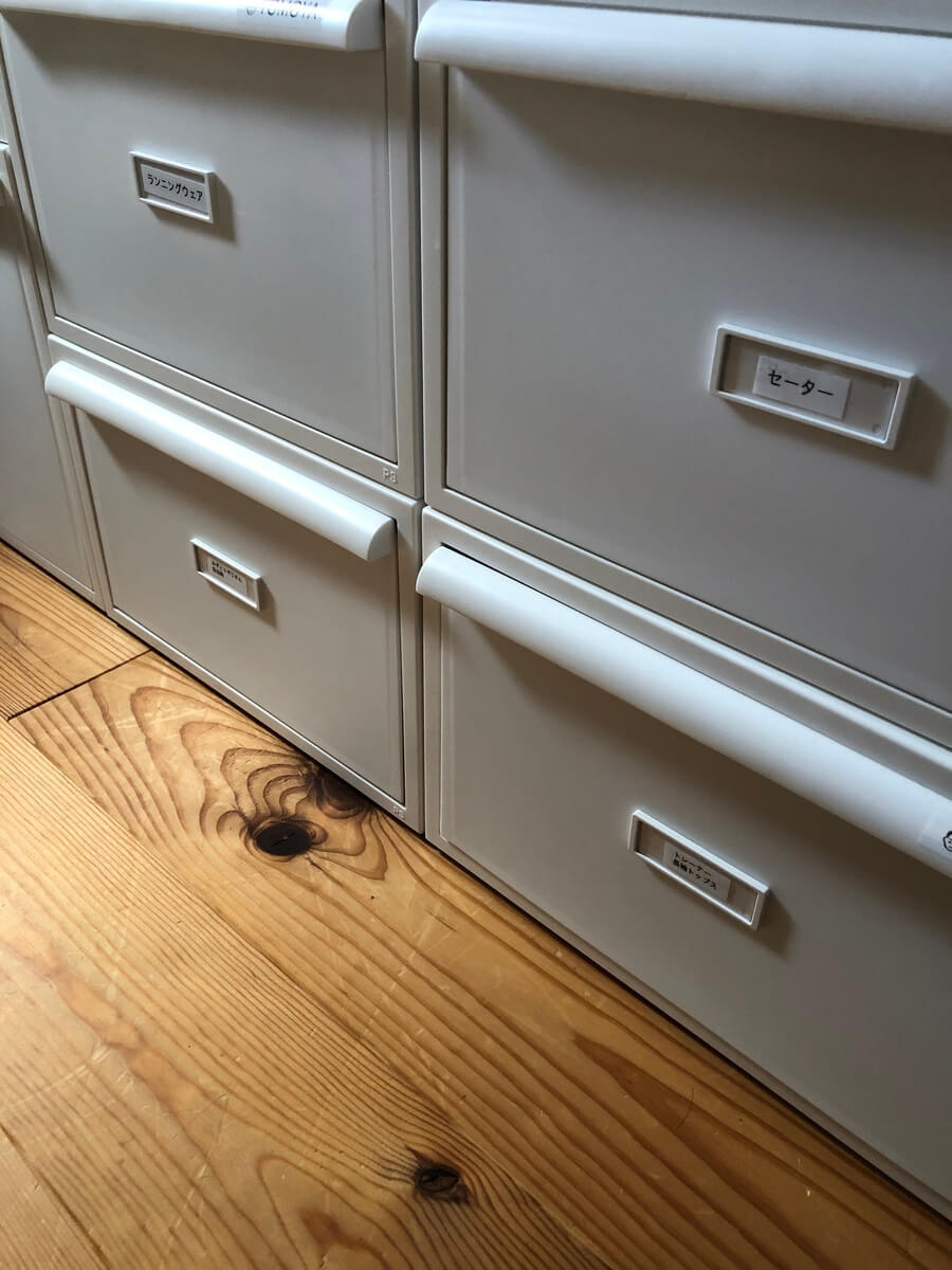 洋服を必要量に絞って、シーズン別にカテゴリー分けして引き出し収納にしたことで、衣替えをしなくていい方法をとりました。