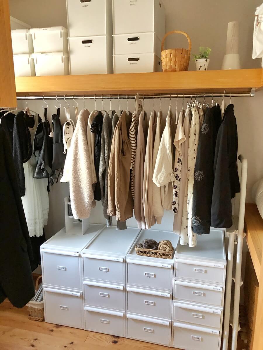 私は白で中身が透けない収納アイテムで揃えました。こちらの収納アイテムは、likeitのクローゼットシステムです。