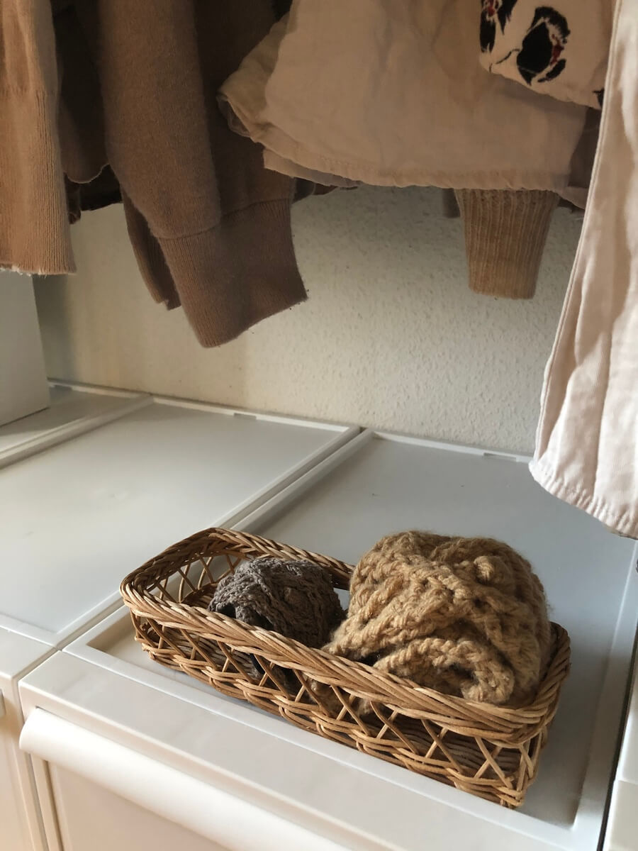 無機質なだけでなく、クローゼットに可愛さも取り入れたいと思った私は、真っ白のボックスだけでなく、チラチラかご収納も取り入れています。