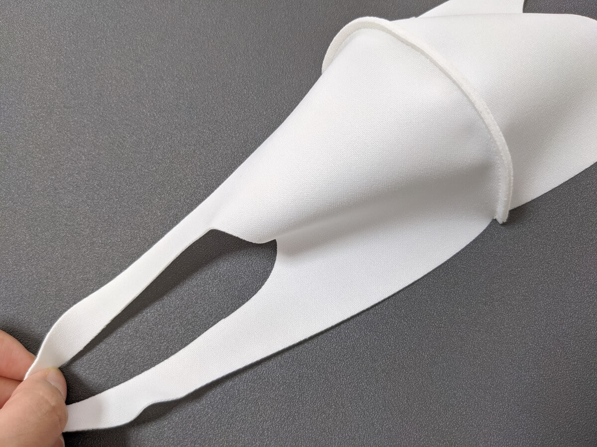 伸縮性のある素材を使っており、引っ張るとこんな風にびよーんと伸びます。 洗濯テストは100回、耳掛け部分はなんと3000回の引っ張りテストをクリアしているそうです。