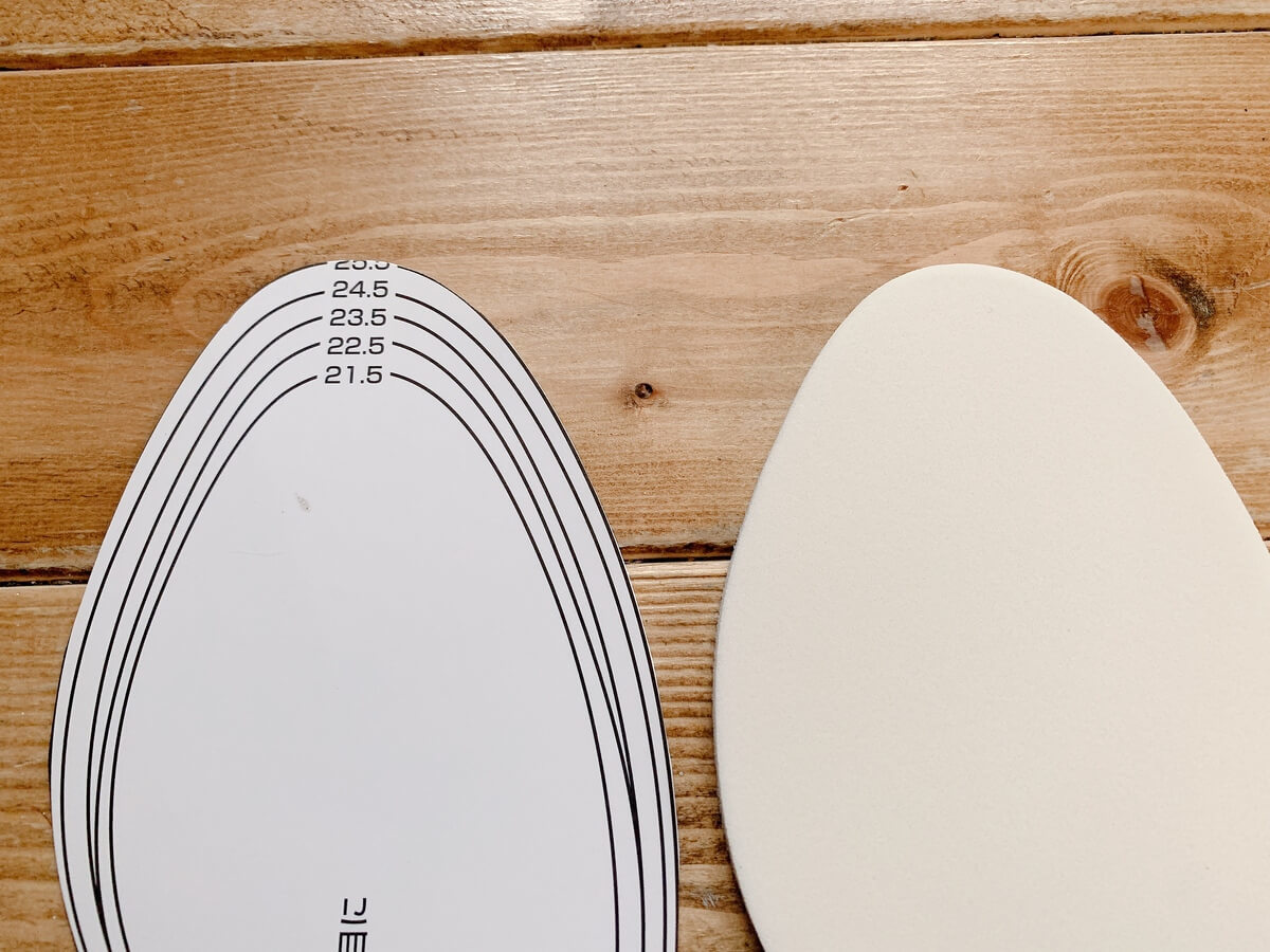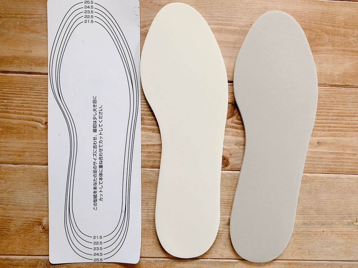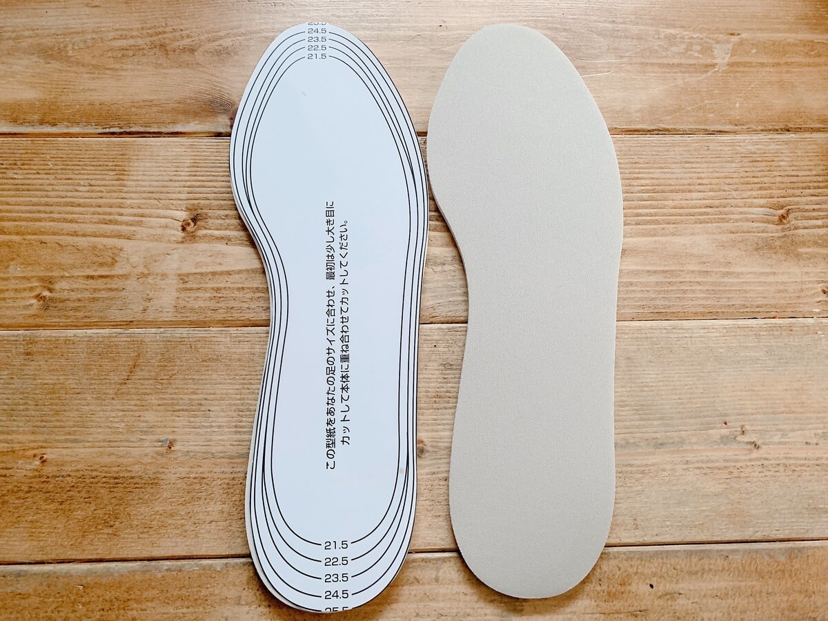 中身を確認してみると、インソール2枚とサイズを合わせるための型紙が入っていました。インソールは表側がグレーのようなカラーで薄い布のような素材が使われていて、裏側はホワイトでツルッとしています。