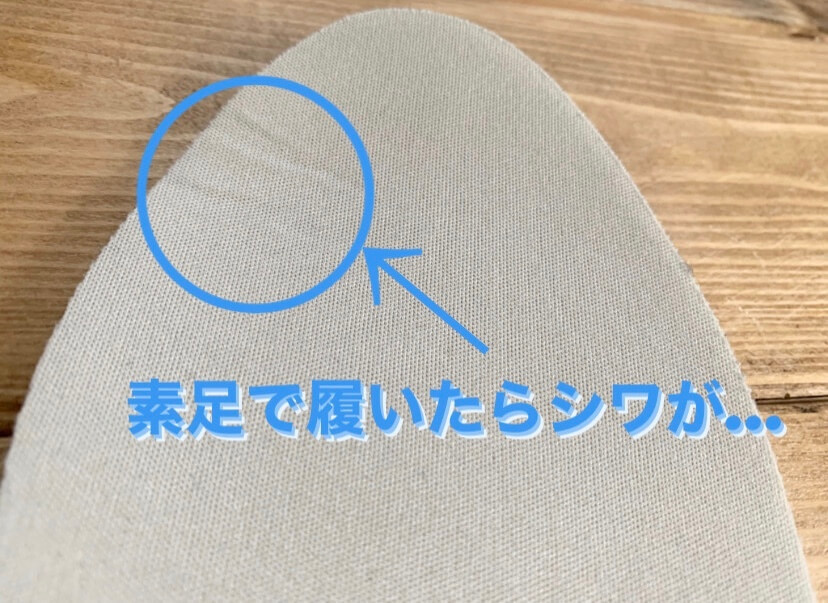 裏側がスルスルする素材のせいが私の足の裏にくっついてシワが寄ってしまいました。グシャッと沢山シワが出来たわけではありませんが、素足で履くのはおススメしません。