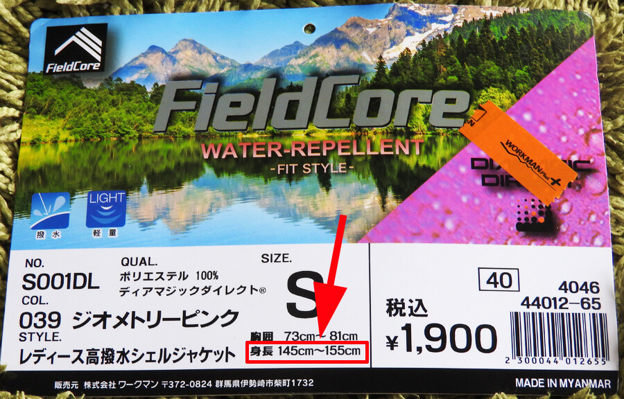 しかし、「レディース高撥水シェルジャケット」1900円(税込)の適応身長を見ると「145~155cm」!!大人用の衣類で自分の身長が適応範囲内に入るにはほぼないため、テンションが上がりました。私と同じ位の身長の方であれば、高揚感にあふれるはず。