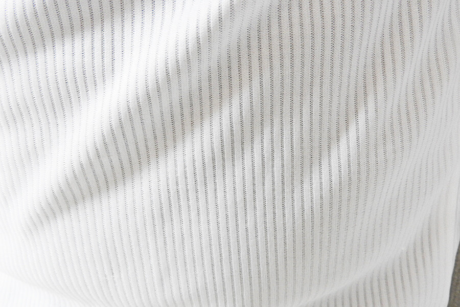 着心地としてはかなり軽やか。身体にほどよくフィットして、動きやすい服ですね。生地はサラッとしていて、肌触りは◎。