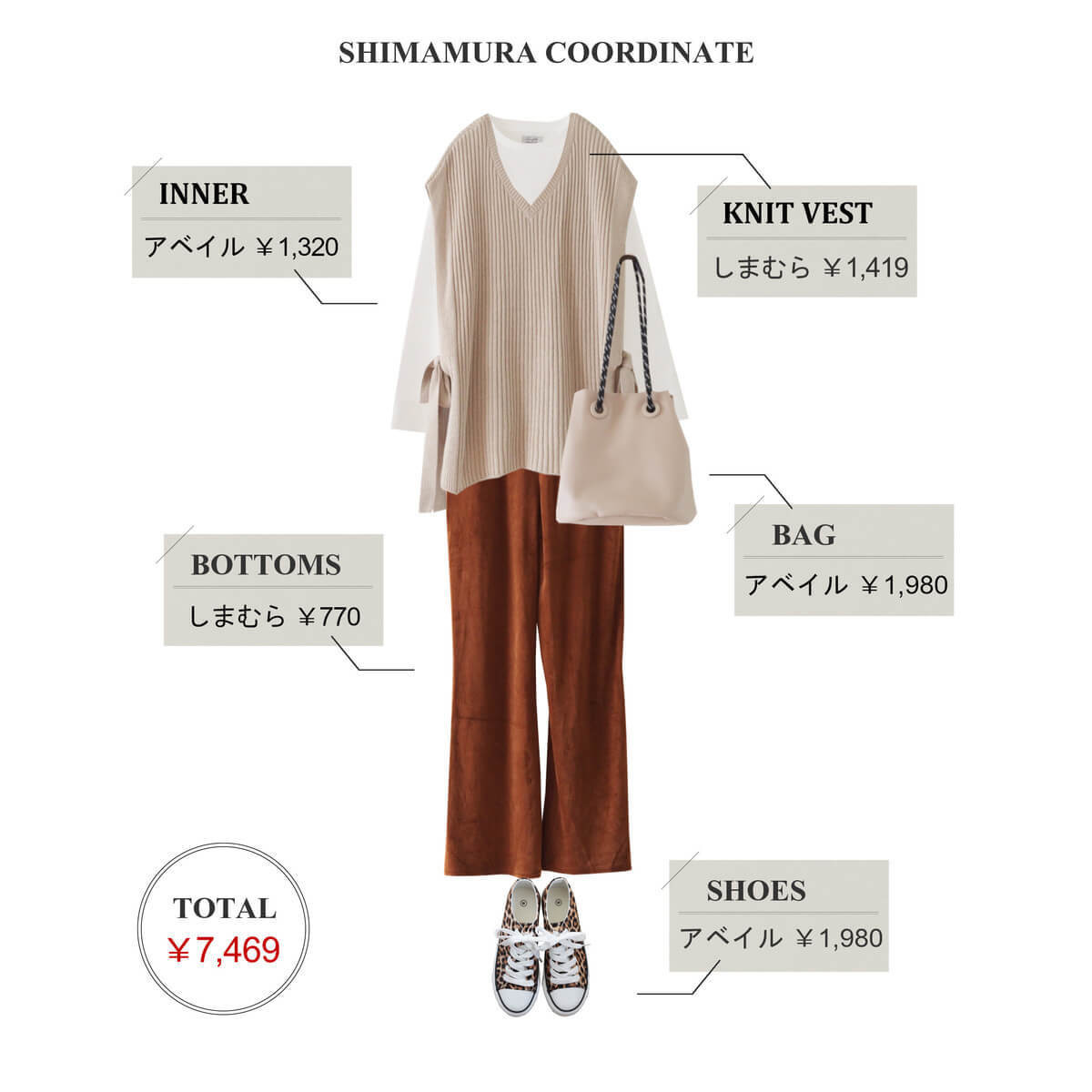 使用したアイテムはすべて「しまむら」と系列店「アベイル」のものです。