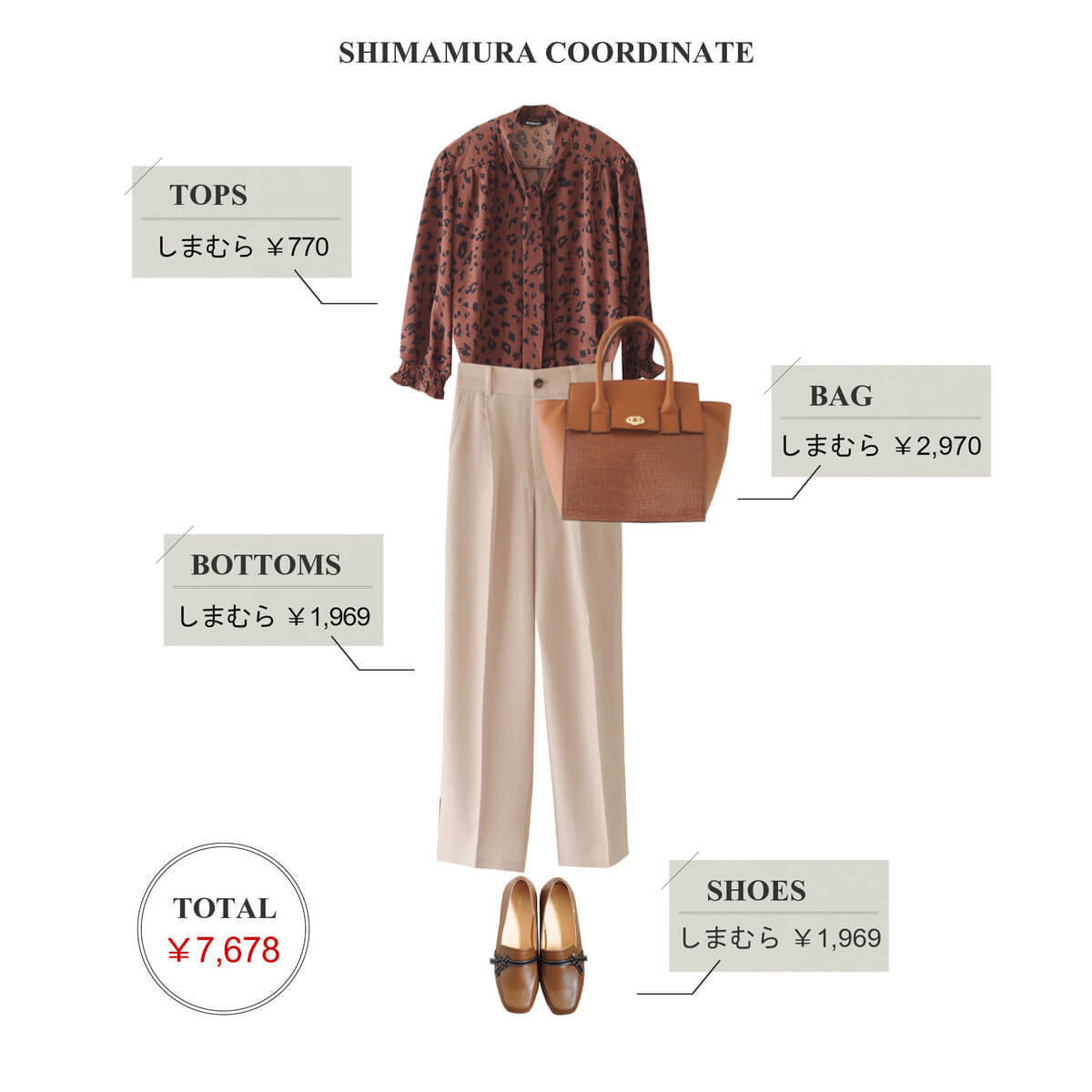 ブラウンをベースにしたレオパード柄が、秋の着こなしによく似合います。
