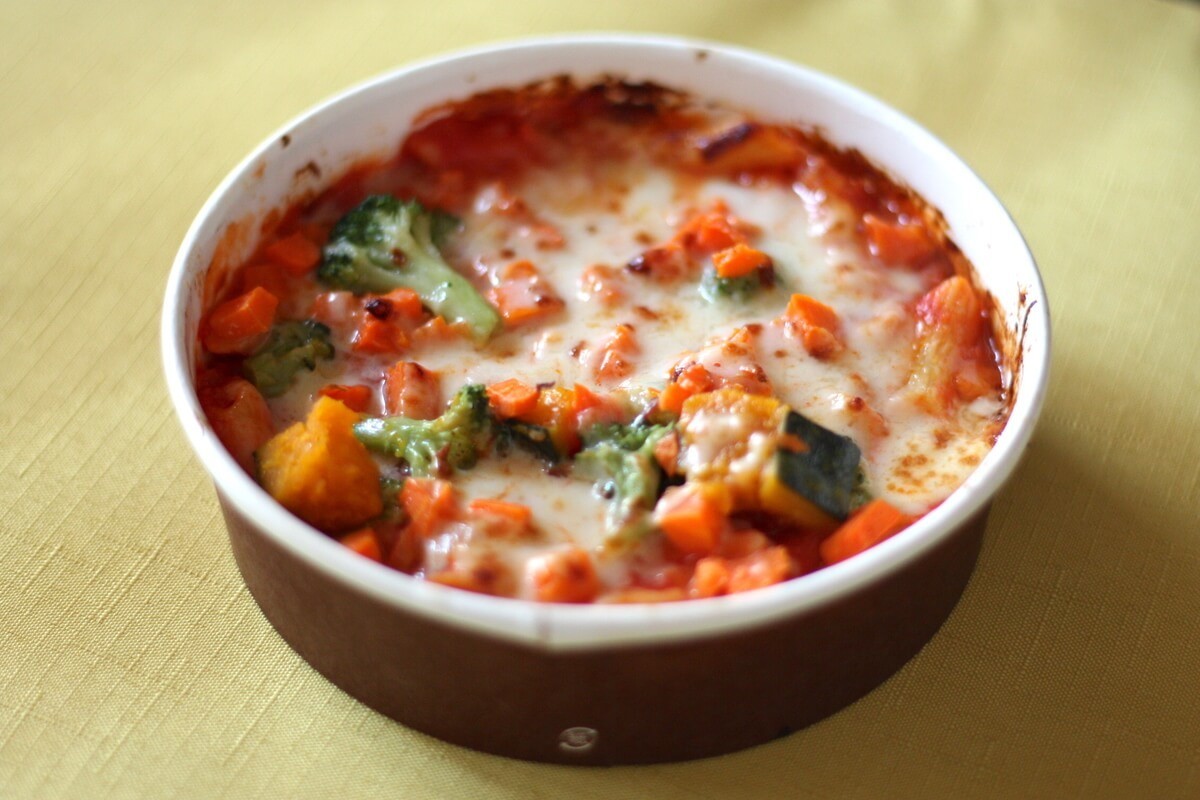 彩の良い3種類の緑黄色野菜を盛り付けたトマトグラタンです。(ファミリーマートホームページより)