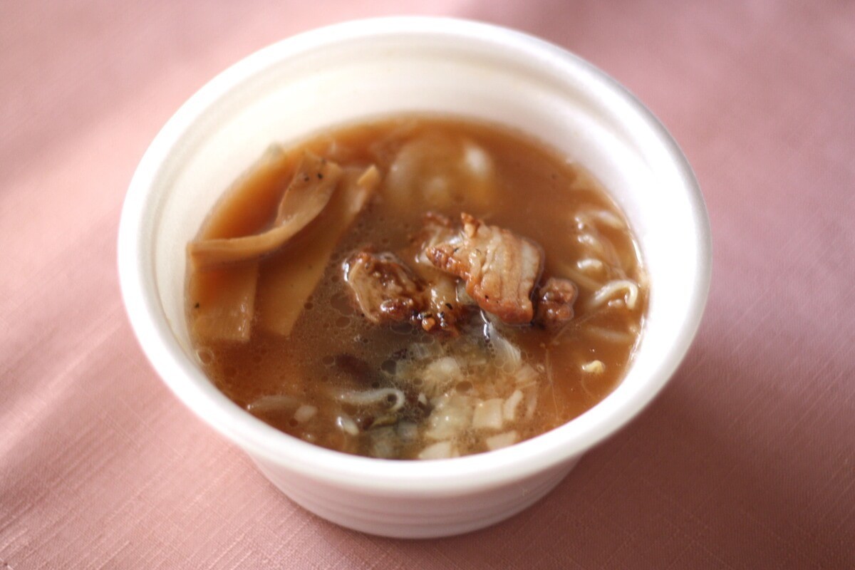 ラーメンが食べたいけど、糖質が気になる方に向けた、ラーメンスープをイメージした野菜スープ(麺無し)です。豚骨ベースのにんにく醤油スープに、野菜、チャーシュー、メンマを入れました。(ファミリーマートホームページより)