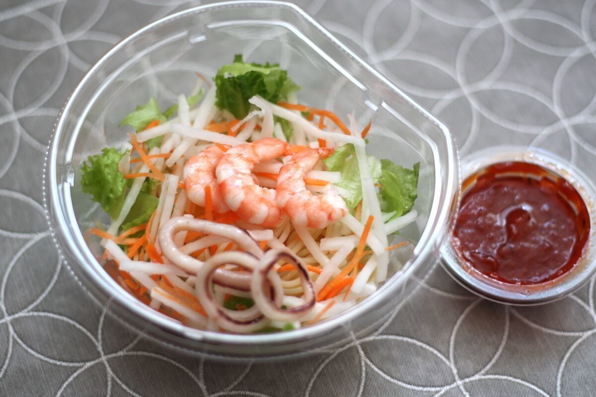 色鮮やかな海老とイカのパスタサラダです。トマトのソース付きです。(ファミリーマートホームページより)