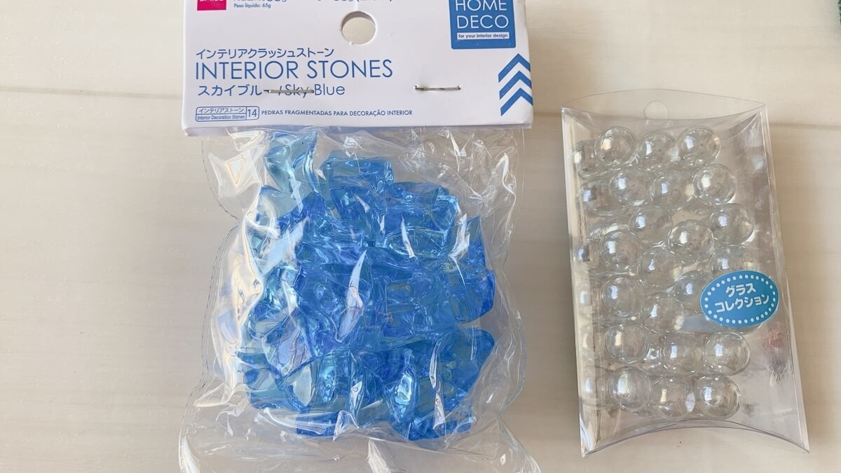 今回は手早くボトルを立ち上げられるように、ダイソーで購入したビー玉やインテリアストーンを使用しました。