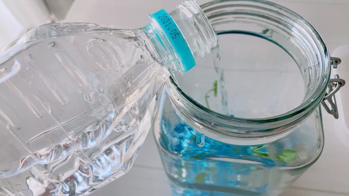 水は水道水でOK。もし魚やエビなどを飼育するのであれば、100均ダイソーにカルキ抜きの薬も売っています。もしくはペットボトルなどに水道水を入れて1日ほど放置しておけば自然とカルキ抜きができますし、水温が気温に合わせて調節されるのでおすすめです。