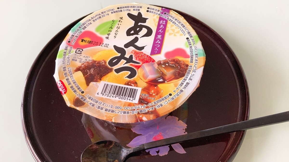 こちらは「粒あん黒蜜入り あんみつ」そのお値段なんと92円(税抜)!