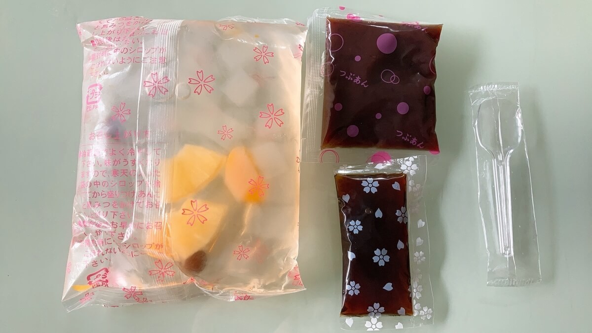 開けるとこのように寒天・あんこ・黒蜜とパウチ分けされておりスプーンまでついていました。これなら出先でも気軽に食べることができますよね。
