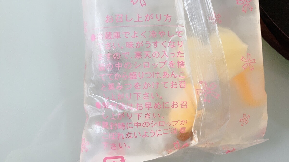 寒天を開けようとしたらパウチの後ろにシロップを捨てて盛り付けるように書いてありました。黒蜜やあんこの味が薄くなるようなのでシロップは忘れずに捨てて盛り付けましょう。