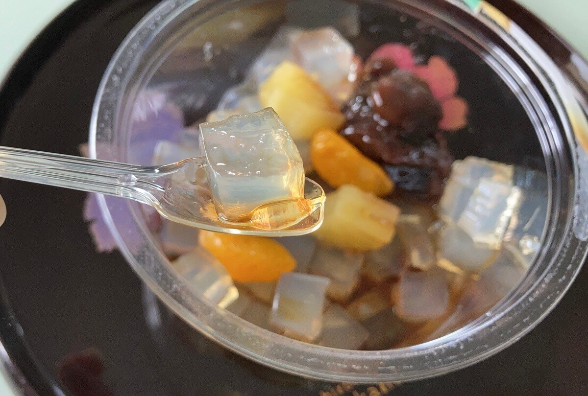 早速実食。破壊レベルなのにパイナップルとみかんも入っています。寒天はコリコリして歯応えよし!あんこと黒蜜は甘いですが、寒天の爽やかさとフルーツの酸味で中和され程よい甘さで美味しかったですよ。