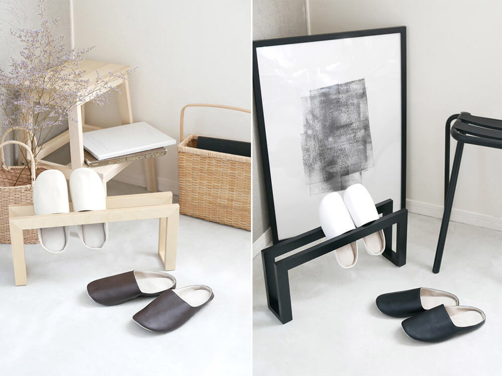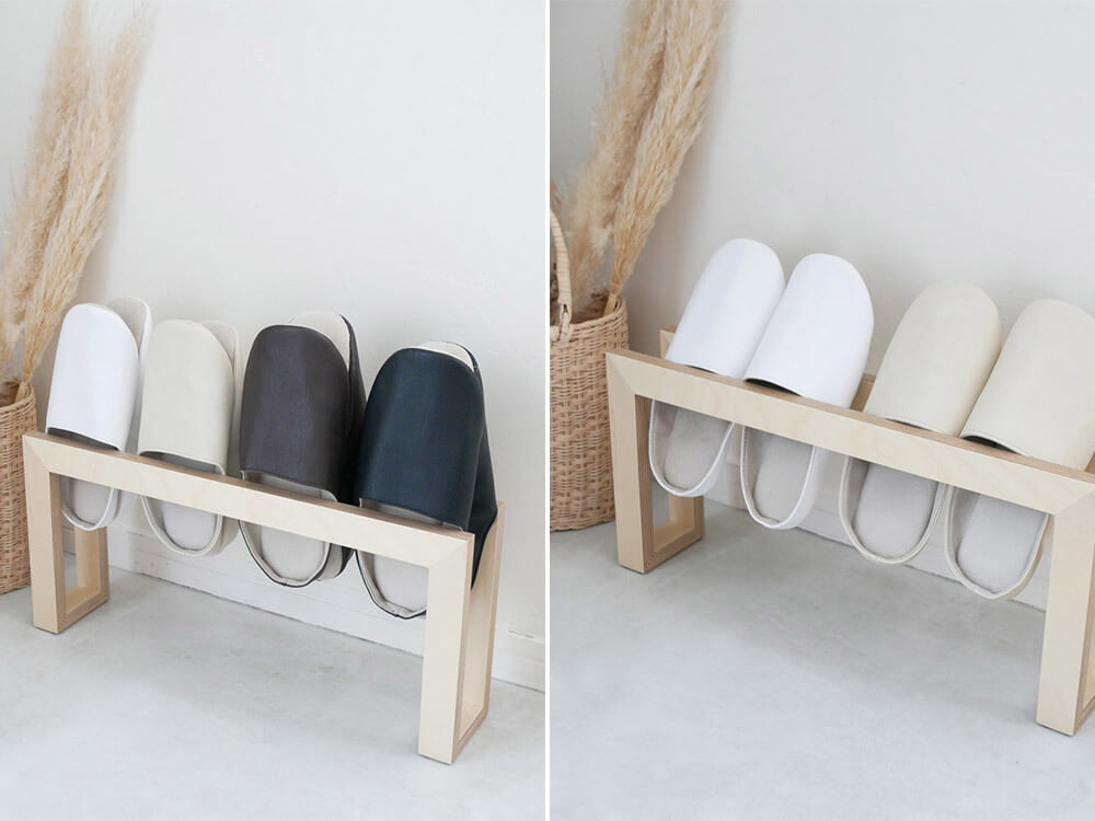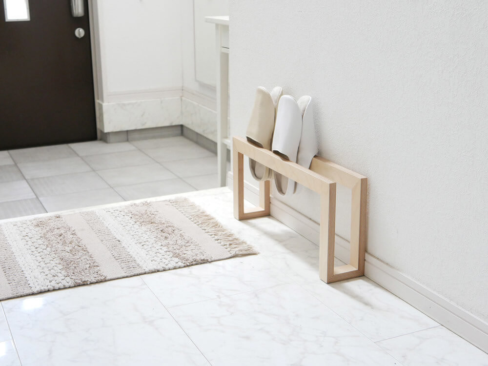 フィンランドバーチプライウッドを使用したコの字型、スリッパラック。玄関に素材の温かみとムードさをプラスしてくれます。