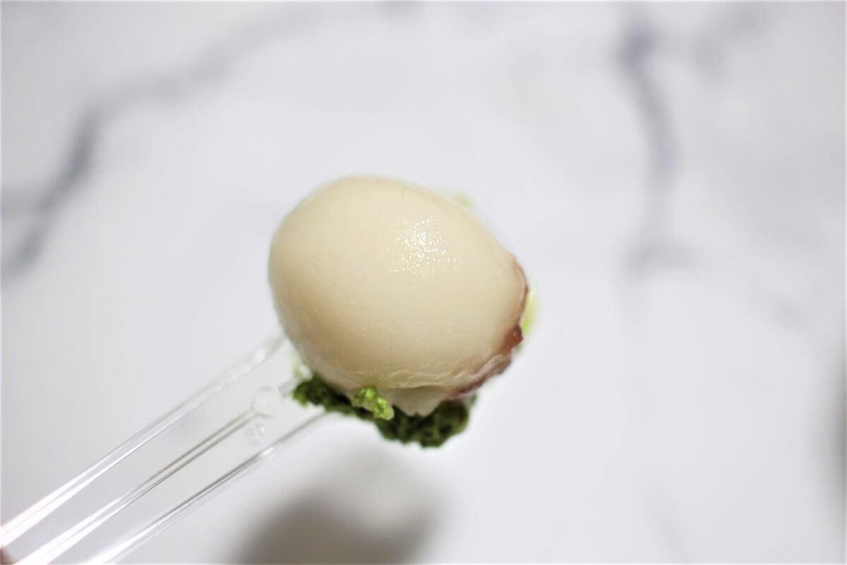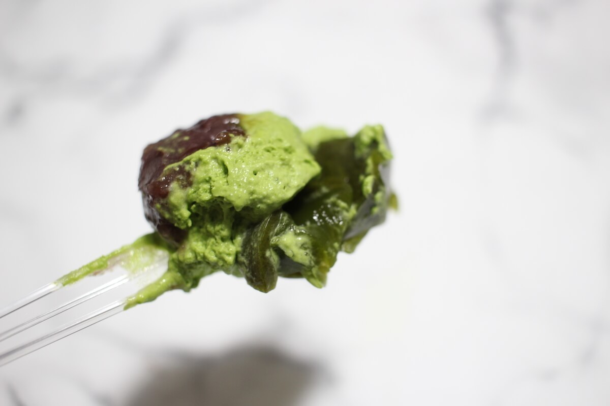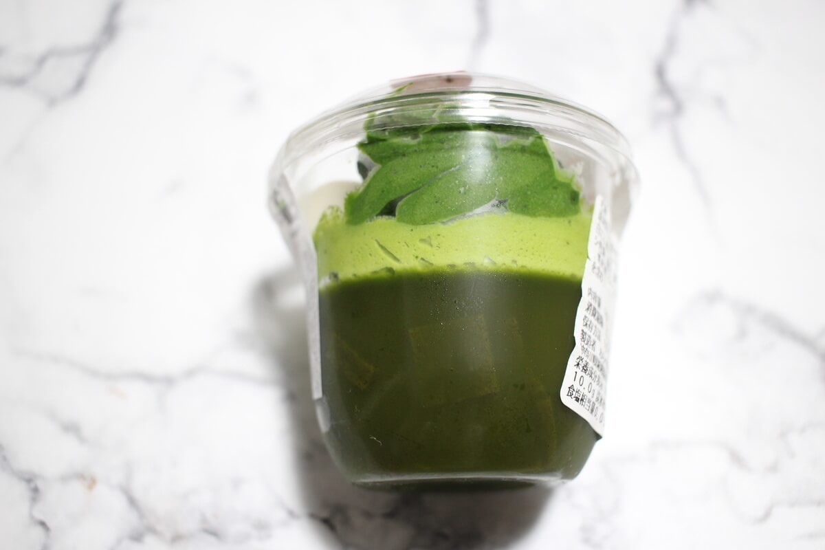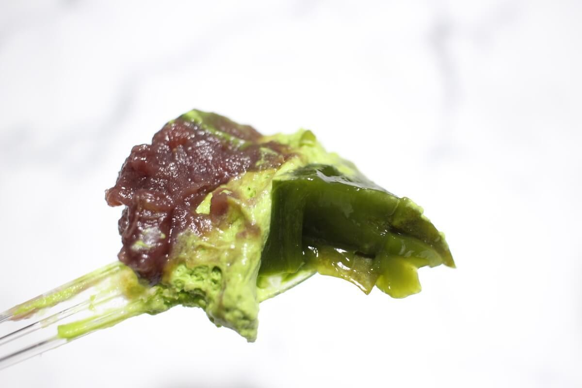 下にはグリーンティー風ゼリーと抹茶寒天が。 キューブ型でごろっと入った抹茶寒天は、しっかりとした歯ごたえが感じられます。