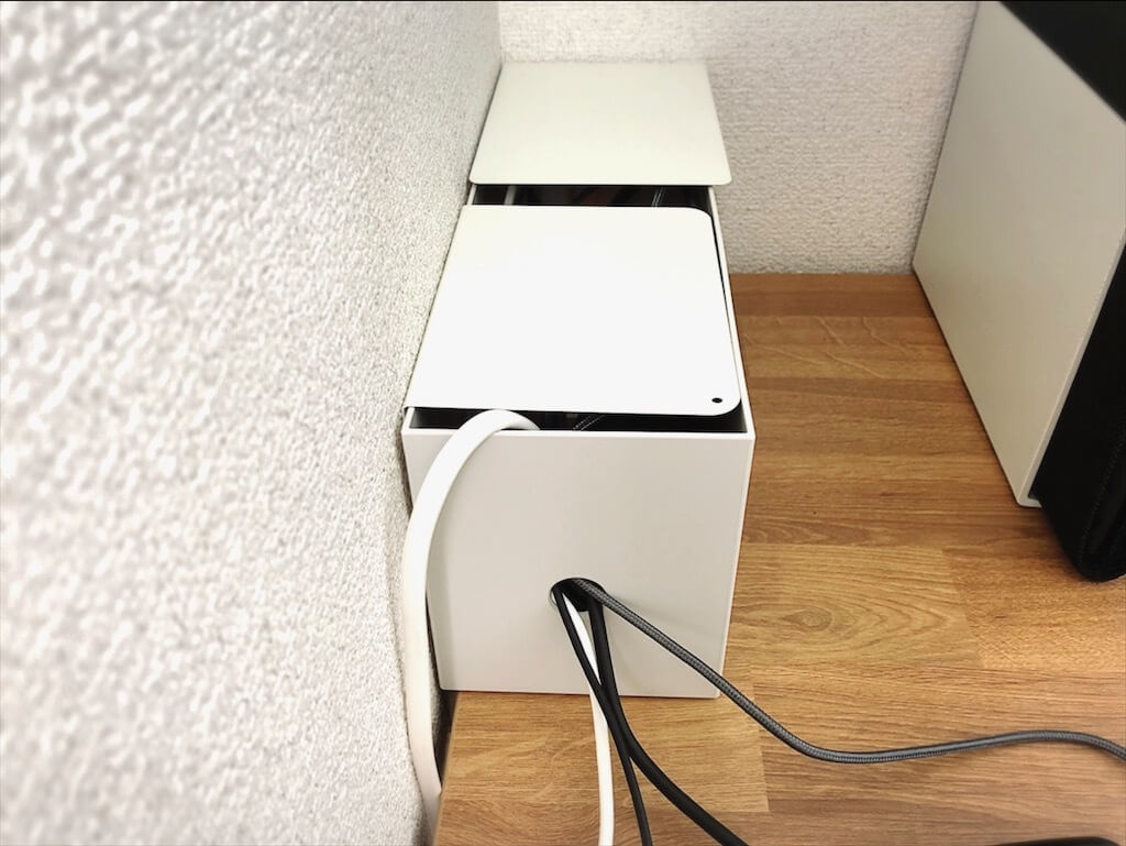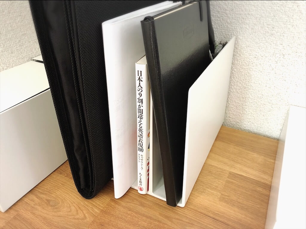 無印良品のファイルボックスにはフタも販売されていますが、コードを出す隙間が欲しいので、ホコリ除けとして前述のダイソーのブックエンドをフタがわりに使っています。