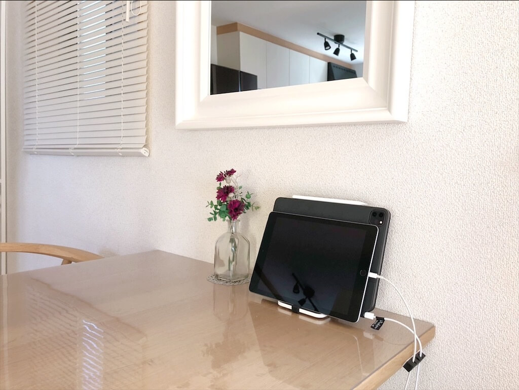個人用のデスクを持たない私と息子は、リビングダイニングでそれぞれタブレット(iPad)を使用しています。