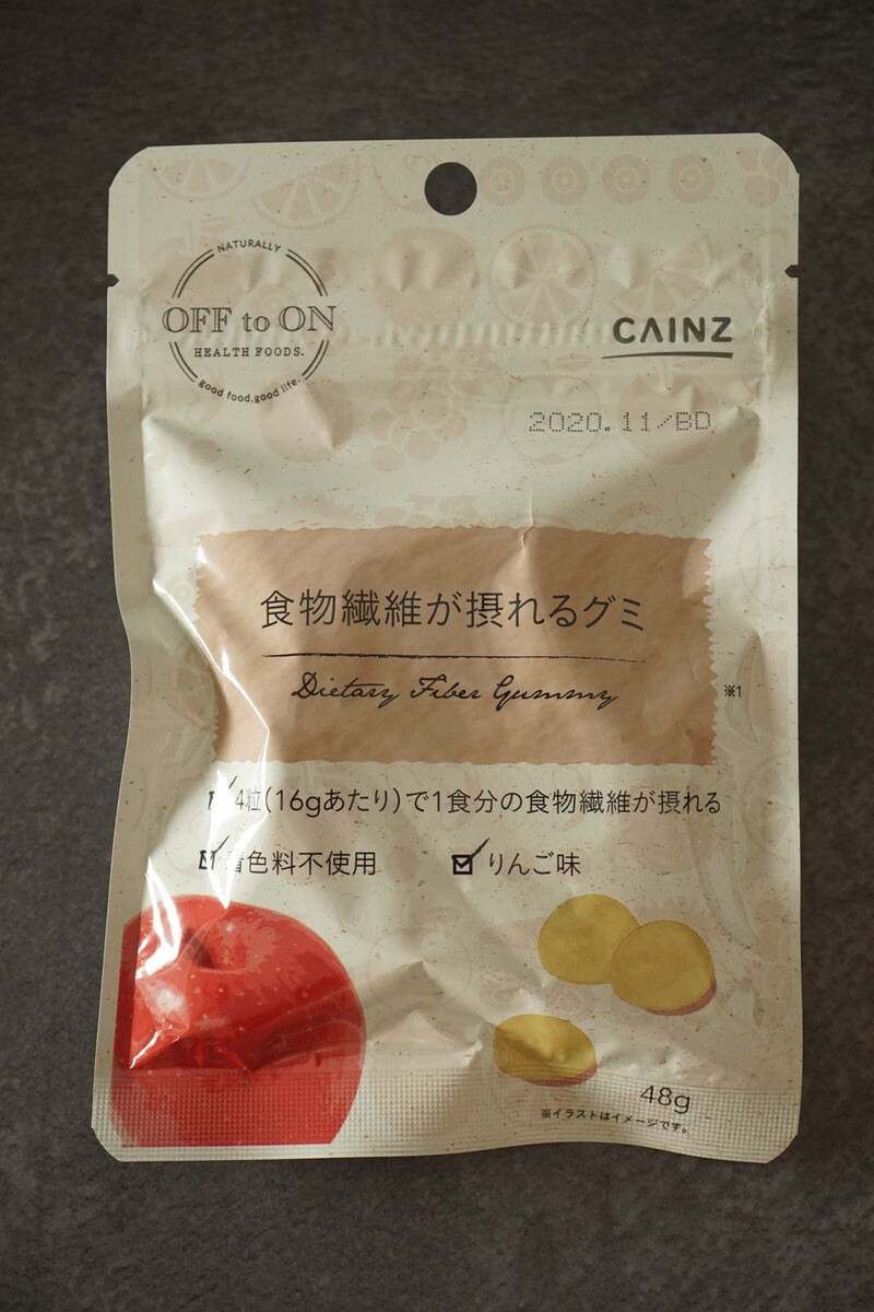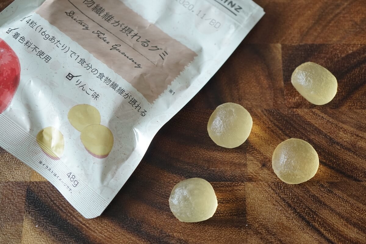 こちらは着色料不使用で4粒(16gあたり)で1食分の食物繊維が摂れるリンゴ味のグミ。