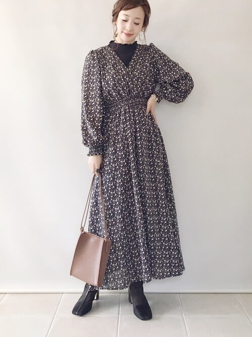 パフスリーブがかわいいカシュクールワンピースのインに重ねて。