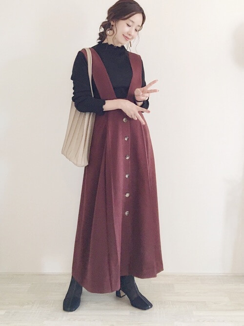 ジャンパースカートを大人っぽく見せるには、長め丈を選ぶのがコツです。