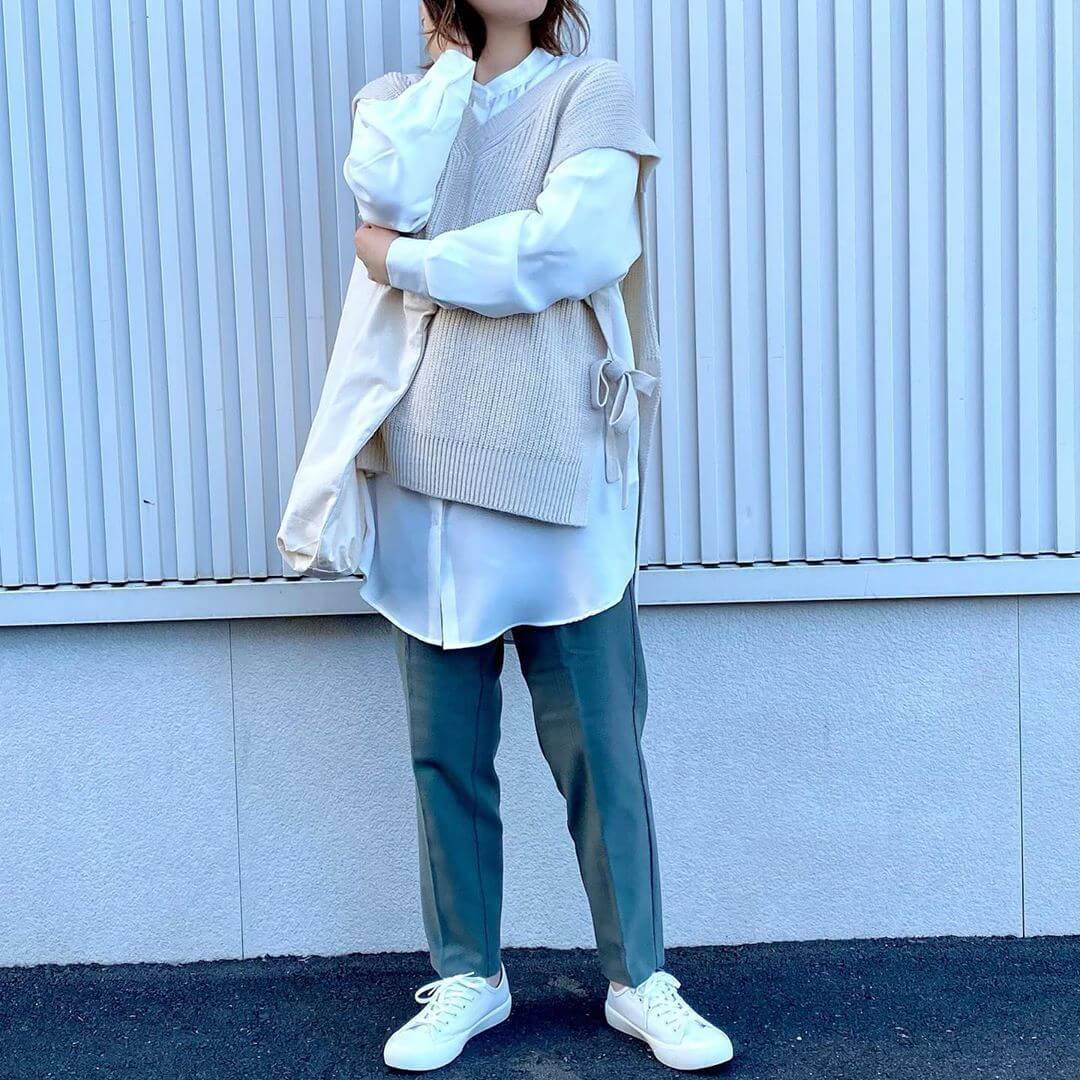 こちらはオフホワイトの「バンドカラーロングシャツ」にナチュラルの「サイドリボンニットベスト」をオン。ナチュラルの「裏起毛カラーストレートパンツ」を合わせたコーデ。