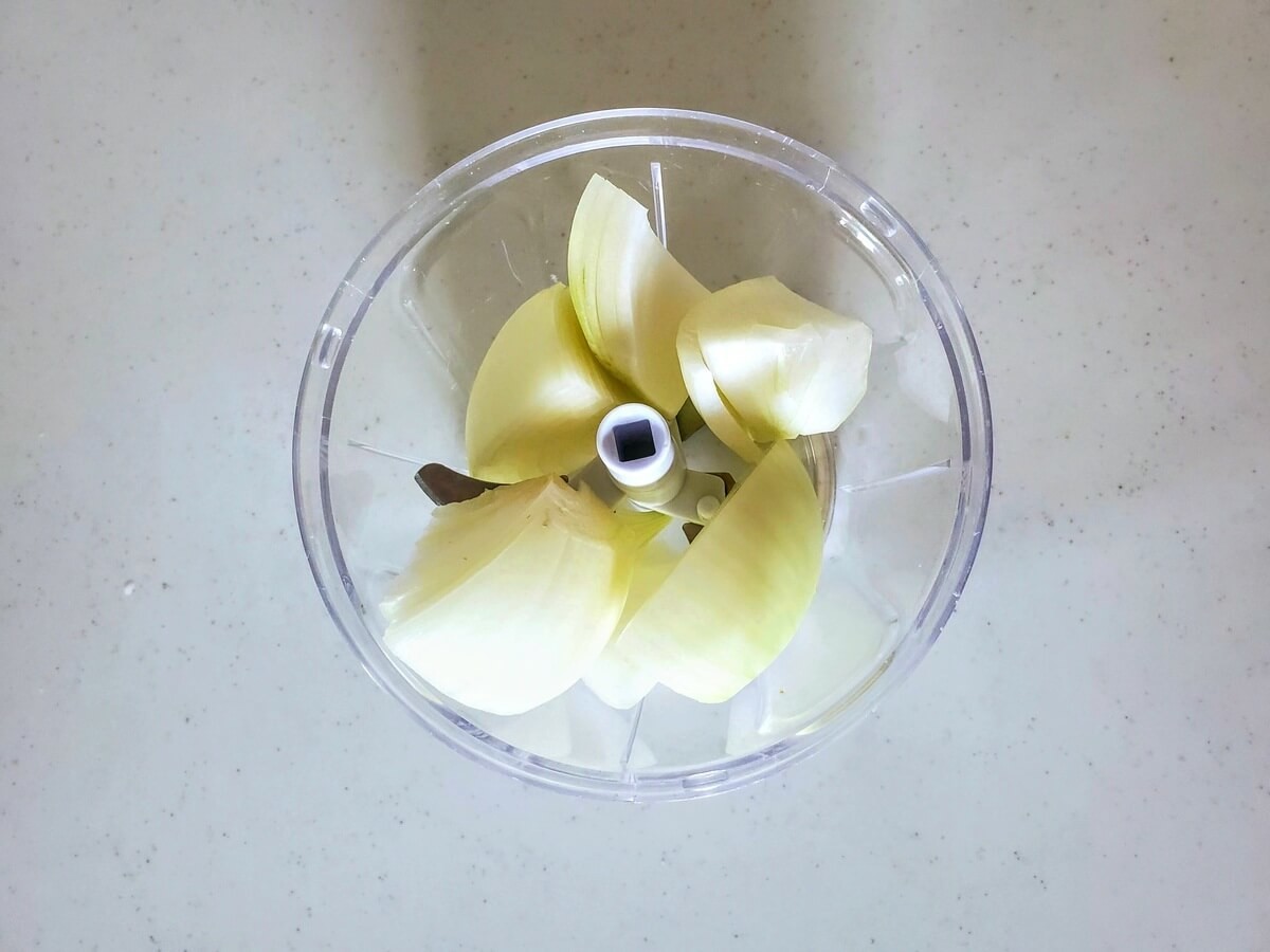 半分に切った玉ねぎを、さらに4等分くらいにして容器に入れます。