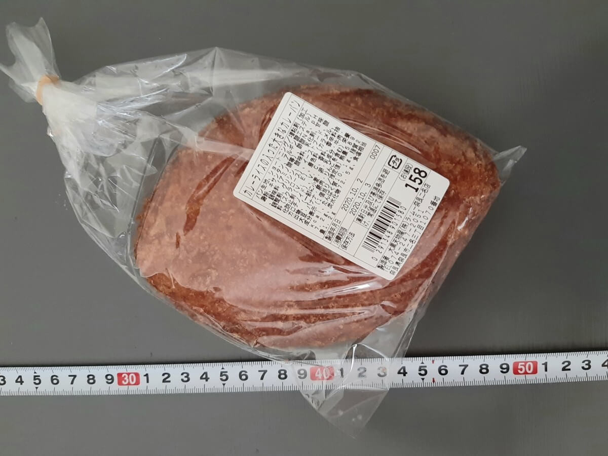 実はこのカレーパン、めちゃくちゃ大きいんです。わかりやすいようにメジャーの横に並べてみました。