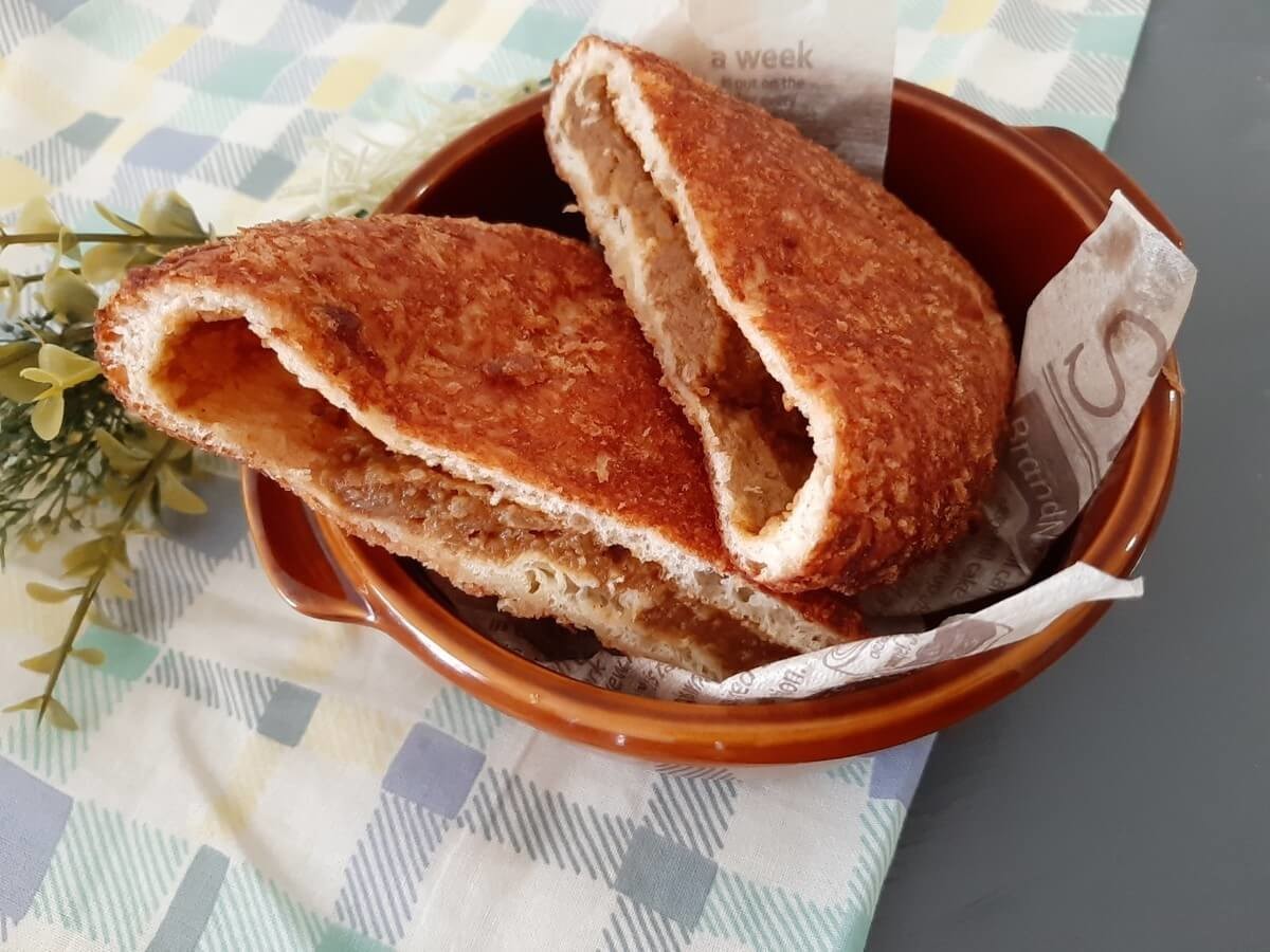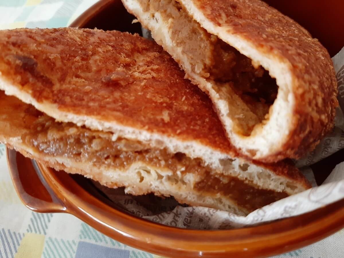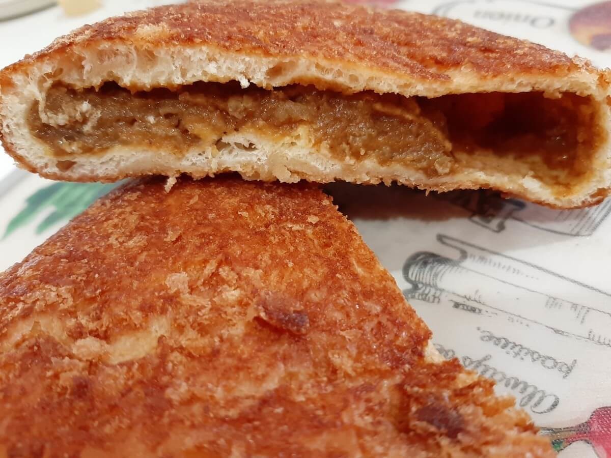 さっそく一口。サクッとした表面の生地とフワッとしたパン、中のカレーは甘いフルーティーな味わいです。あとからピリッとスパイスが効いてきてくせになる味付け。