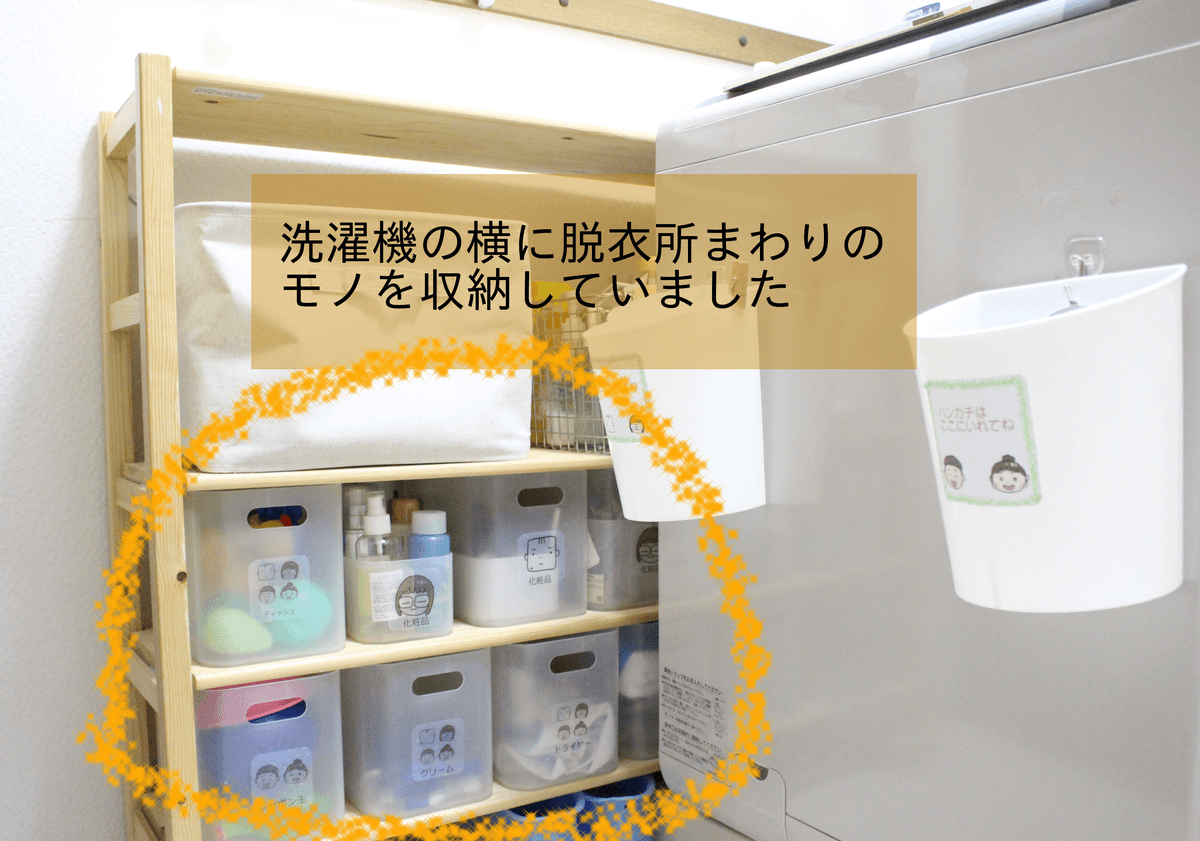 スッキリした空間を維持できるよう、こちらの棚に脱衣所に必要なモノを収納していました。
